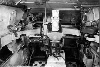 Интерьер боевого отделения танка Luchs, вид на переднюю часть башни. Справа — механизм поворота башни, в центре — казенная часть 20-мм пушки, слева — кронштейн крепления пулемета.