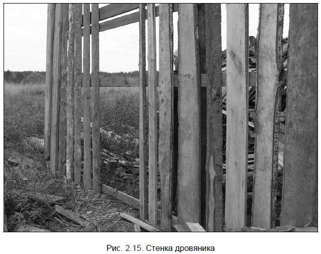 Для хранения дров используется дровяник — сарай со свободной циркуляцией воздуха. Она достигается тем, что на двух противоположных стенках строения вертикальные доски прибиты не вплотную друг к другу, как в любом другом строении, а через равные промежутки, каждый из которых составляет примерно ширину одной доски (рис. 2.15).