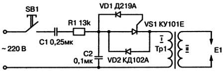 Импульсный генератор образован тиристором VS1 и диодом VD1, соединение которых представляет собой аналог динистора, и конденсатором С2. Диод VD2 защищает тиристор от пробоя обратным напряжением, возникающим благодаря ЭДС самоиндукции обмотки трансформатора.