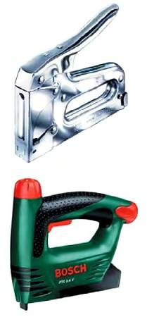 Пневматический и электрический степлеры используются чаще всего профессионалами. Они стоят дороже, но позволяют в короткий срок выполнить больший объем работ, не уставая.
