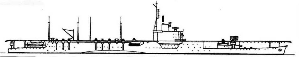 Сохранялась 4-вальная энергетическая установка, но мощность уменьшалась до 72000 л.с. (4 котла), что считалось достаточным для скорости 29 узлов. По другим сведениям также убирались два кормовых турбоагрегата (внешние валы), а их отсеки переделывались в топливные цистерны. Вооружение составляли 27 самолетов (12 бомбардировщиков и 15 истребителей, из которых только 10 истребителей могли храниться в ангаре), 4 новых 100-мм зенитки и 48 25-мм автоматов в строенных установках, а также 30 глубинных бомб и 6 28- ствольных 127-мм ракетных установок. Экипаж должен был состоять из 1015 человек. В ноябре корпус с помощью плавбазы «Дзингей» отбуксировали в Сасебо, где на верфи ВМФ начались работы. Ввести авианосец в строй планировалось весной 1945 года, но из-за общего тяжелого положения промышленности и нехватки подготовленных летчиков срок готовности перенесли на август. В марте из-за более срочных дел, связанных с постройкой катеров-“самоубийц”, авианосец пришлось бросить в 80%-й готовности. Он уже имел полетную палубу и все спонсоны, на которых, однако, еще не было вооружения. Успели установить только несколько ракетных установок. Корабль отбуксировали в бухту Ибису около Сасебо, где его и застали оккупационные американские войска. В 1947 году несостоявшийся авианосец был разобран на металл в Сасебо.