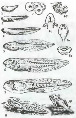 (Вверху в центре – дробление икринки. Вверху справа – развитие головастика). Схема наглядно показывает сочетание плавности и непрерывности процесса развития и его расчлененности на ярко выраженные этапы