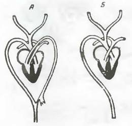 Сердце и дуги аорты крокодила (А) и птицы (Б).