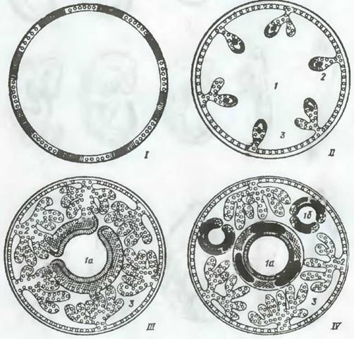 Схемы поперечного разреза легких: I примитивные хвостатые амфибии; II – амфибии; III – рептилии; IV- млекопитающие и крокодилы. Наглядно видно увеличение поверхности газообмена, отвечающего росту его интенсивности, который связан с продвижением по эволюционной лестнице