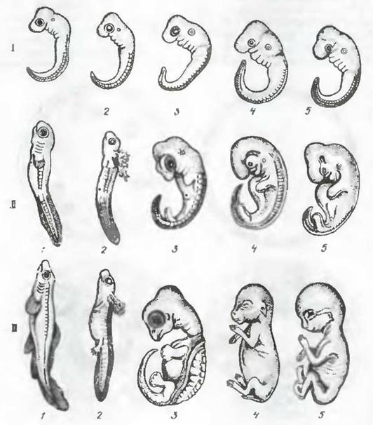 Три стадии развития: рыбы (1), саламандры (2), черепахи (3), крысы (4) и человека (5). Зародыши разных видов очень похожи друг на друга, но по мере развития это сходство утрачивается