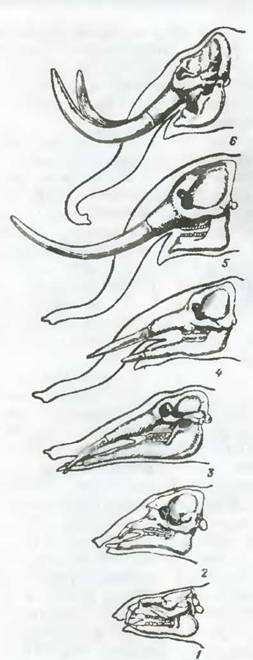 Эволюция черепа хоботных: от самых древних (внизу) до современных (вверху)