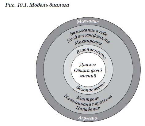 Чтобы организовать мышление и облегчить понимание принципов в целях их дальнейшего применения, рассмотрим модель, представленную на рис. 10.1. Она состоит из концентрических кругов и напоминает мишень. Обратите внимание, что в центральном круге находится общий фонд мнений — это центр мишени, или цель диалога. Если обмен мнениями происходит свободно, то они попадают в этот фонд, представляющий собой идеальный пример коллективного мышления.