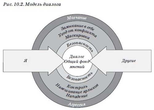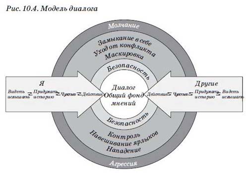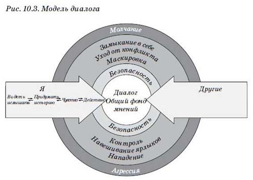 Я и другие (рис. 10.2). Вы обозначены на рисунке стрелкой с надписью «Я», а ваши собеседники — стрелкой, которая названа «Другие». Эти стрелки (обе указывающие на центр общего фонда мнений) показывают, что все участвуют в диалоге. Все мысли свободно поступают в общий фонд мнений. Прием «Учимся наблюдать» в данном случае означает, что мы следим за тем, чтобы любая из этих стрелок не отклонялась вверх или вниз — к молчанию или агрессии. Если такое случается, то либо вы, либо ваши собеседники начинаете избегать участия в диалоге.