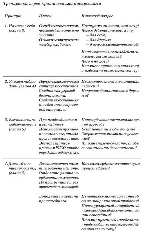 Вот еще один, последний прием, который поможет упорядочить изложенный материал об искусстве ведения важных дискуссий. С его помощью вы подготовитесь к предстоящей беседе и многому научитесь на примере уже состоявшихся мастеров диалога.