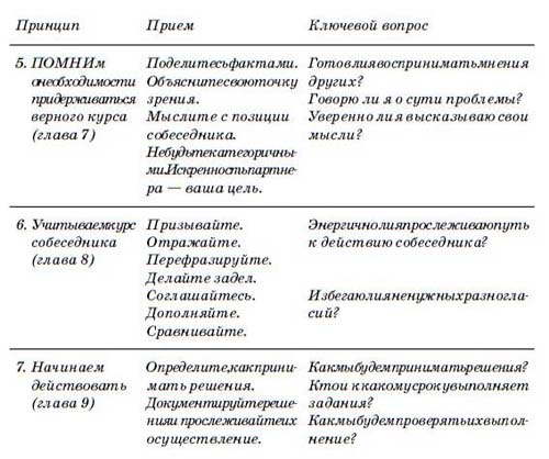Посмотрите на приведенную ниже таблицу. В первом столбце перечислены семь принципов ведения диалога, о которых мы говорили. Во второй включены приемы, связанные с каждым из этих принципов. Лучше всего начинать тренировку с последнего столбца, так как в нем приводятся вопросы, которые помогают применить все навыки в беседе.