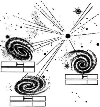 Рис. 14. Схема расширения Метагалактики. Красное смещение спектральных линий возрастает с расстоянием.