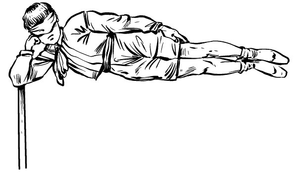 Он вынес на середину сцены стойку, состоящую из нижней доски и укрепленной в ней отвесно палки, примерно в рост человека. Пододвинув к палке стул, он знаком приказал мальчику опереться правой рукой о верхний конец палки, достал еще одну палку, подставил ее под левую руку, а под ноги — стул. Мальчик повис в воздухе, опираясь на три точки: две палки и стул.