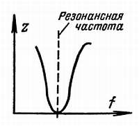 Рис. 39. Полное сопротивление колебательного контура изменяется в зависимости от частоты тока и становится практически равным нулю на резонансной частоте.