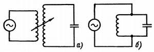 Рис. 42. Ввод энергии в колебательный контур с помощью взаимной индукции (а) или путем непосредственного включения контура (б).