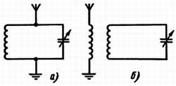 Рис. 44. В приемнике контур настройки может включаться непосредственно между антенной и заземлением (а) или же индуктивно связываться с катушкой, по которой протекают токи, наводимые принимаемыми сигналами (б).