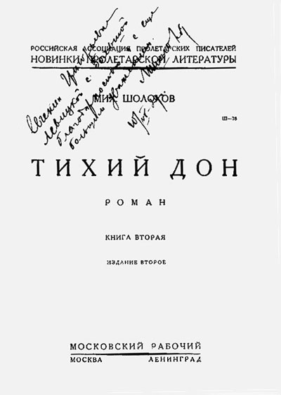Титульный лист второй книги романа «Тихий Дон» с дарственной надписью М. А. Шолохова