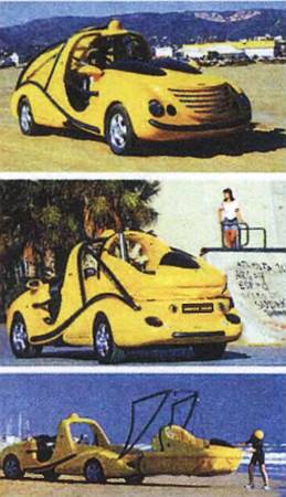 ТО АВТОМОБИЛЬ, ТО СКУТЕР… Конечно, автомобили-амфибии — далеко не новость. Но немецкие инженеры сумели вдохнуть в старую идею новую жизнь. В итоге на шоссе теперь появился Rinspeed X-Trem с мерседесовским шасси, полным приводом на все колеса и 350-сильным 5,5-литровым двигателем. На шоссе машина способна развить скорость до 235 км/ч. А возле воды достаточно нажать кнопку, и багажник с пропеллером превращается… в элегантный скутер на воздушной подушке, который с равным успехом способен скользить над песками, снегами или водой.