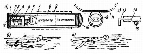 При плавании с доской (см. рис. 39, б) прибор устанавливается под доской, поясок закрепляется на доске. При плавании без доски прибор при помощи пояса закрепляется на теле пловца несколько ниже талии (см. рис. 39, в). При движении пловца в воде резиновая мембрана прогибается от встречного сопротивления воды. Степень прогибания зависит от скорости передвижения. При достижении определенной скорости резиновая мембрана 12 прогибается настолько, что перемещающаяся вместе с ней металлическая мембрана 3 касается контакта винта 6. При этом цепь звукового генератора замыкается, и пловцу через телефонную капсулу подается сигнал.