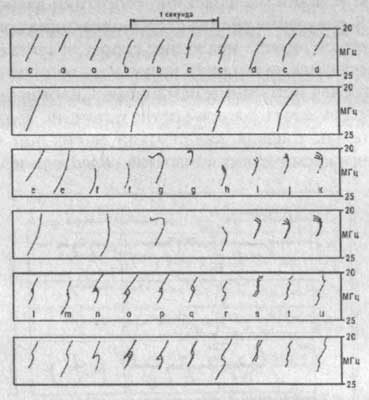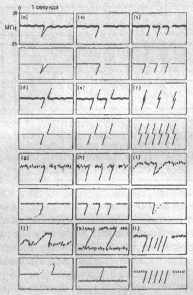 Рис. 57. Формы S-всплесков, наблюдавшиеся Й.Й. Риихимаа и воспроизведенные на компьютере (радиоисточник удаляется от Юпитера).