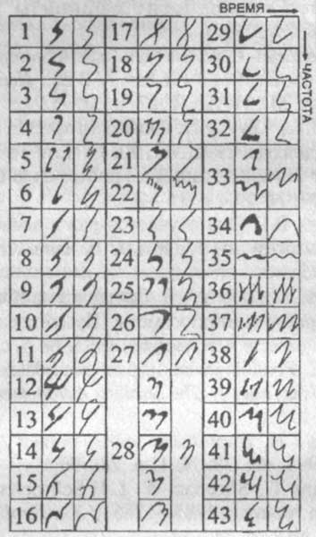 Рис. 55. Простейшая форма загадочных S-всплесков Юпитера — наклоненные полоски на плоскости «частота-время». Излучение показано черным цветом. Ниже находится таблица сложных форм S-всплесков — «Алфавит».