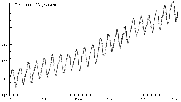 Установлено, что на протяжении трех последних десятилетий содержание CO2 в атмосфере возрастало примерно на 0,0001% в год. Однако за тот же период времени средние температуры в мире, несмотря на развитие промышленности, снизились приблизительно на ГС. Возможно, это объясняется тем, что повышенное содержание аэрозолей (и другой тонкодисперсной пыли) в атмосфере сильно уменьшило интенсивность солнечной радиации, однако ожидаемое в связи с этим похолодание было частично скомпенсировано в результате повышения уровня CO2.
