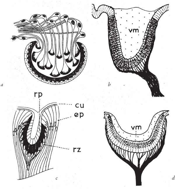 Рис. 5.4. Глаза камерного типа разных животных: (а) плоского червя; (b) двустворчатого моллюска; (с) многощетинкового червя полихеты; (d) моллюска блюдечко.