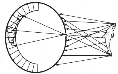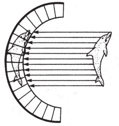 В любом случае сам по себе глаз-чаша не способен формировать хорошее изображение – хорошее в нашем понимании, то есть удовлетворяющее нашему придирчивому глазу. Тут надо пояснить, как формируется изображение в глазу человека по законам оптики. Чтобы разобраться в этой проблеме, давайте выясним, почему без дополнительных органов слой фоторецепторов в вогнутой чаше (камере) не покажет, скажем, дельфина, даже если этот самый дельфин находится прямо перед ними.