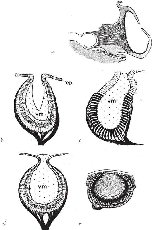 Рис. 5.8. Путь к формированию неидеального, но достаточно четкого изображения. Глаза беспозвоночных: (а) узкое отверстие моллюска Nautilus; (b) морской улитки; (с) двустворчатого моллюска; (d) морского ушка; (е) нереиды.
