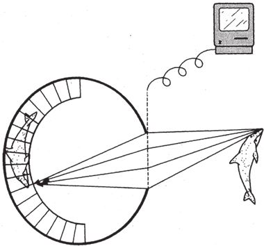 Рис. 5.7. Принцип действия глаза с маленьким отверстием. Конкурирующих изображений дельфина больше нет. Попавшие в отверстие лучи формируют одно четкое перевернутое изображение.