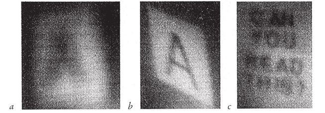 С помощью разных подручных средств, не предназначенных для этой цели, я получил кое?какие картинки. На рис. 5.12а вы видите большую букву А, отображенную на листе бумаги, который я поместил на заднюю стенку камеры-обскура – глухой картонной коробки с маленьким отверстием на одной из сторон. Без подсказки вы, возможно, и не опознали бы букву. Чтобы она получилась достаточно яркой и ее вообще можно было бы разглядеть, я просверлил довольно большую дырку, диаметром примерно в сантиметр. Я мог бы сделать ее поменьше, и тогда картинка получилась бы более резкой, но не хватило бы чувствительности пленки: мы снова вынуждены идти на тот же компромисс.