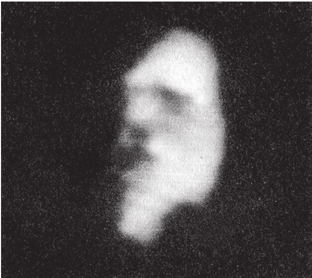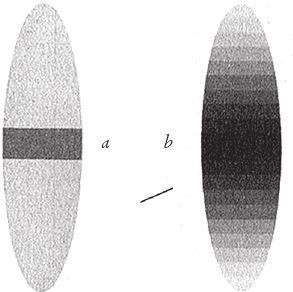 Не во всех типах фасеточных глаз входящие световые потоки строго разделены. Это свойственно только глазам аппозиционного типа. Существуют по меньшей мере три разновидности так называемых суперпозиционных фасеточных глаз, в которых принимаются не такие решительные меры. Ни тебе улавливания лучей в трубки, ни оптико-волоконных технологий – свет проходит через хрусталик одного из омматидиев и попадает на фоторецептор соседнего омматидия. Хрусталики всех омматидиев дружно формируют единое изображение на общей сетчатке, образованной светочувствительными клетками всех омматидиев вместе взятых. Майкл Лэнд показал, как выглядит портрет Чарльза Дарвина, если рассматривать его сквозь составной хрусталик суперпозиционного фасеточного глаза светляка (рис. 5.26).