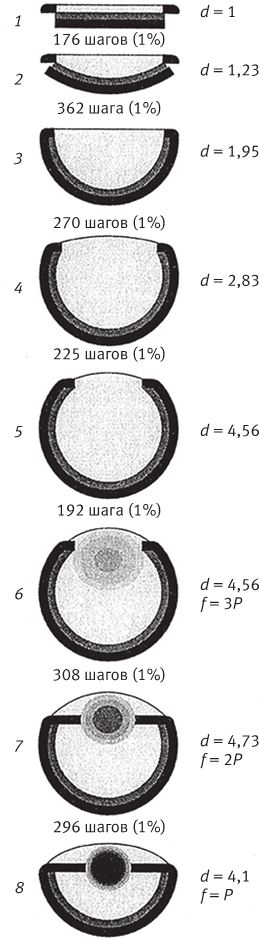 Такие программы как NetSpinner, достоверно моделирующие ход эволюции, весьма информативны: вы начинаете с самого примитивного состояния и ждете финальной стадии развития. Можно прервать эксперимент на любом ключевом моменте различных направлений эволюции – это были бы альтернативные пики горы Невероятности. Мы могли бы провести эксперимент в режиме эволюции и с моделью глаза – и получили бы убедительную иллюстрацию истории. Однако в реальности эволюция модели внесет ненамного больше ясности, чем более систематический анализ пути (или путей) к вершине (или к вершинам) горы Невероятности. Естественный отбор выбирает дороги, которые выходят из конкретных точек, всегда идут вверх и никогда вниз. Если изучать модель в режиме эволюции, естественный отбор пойдет по этому пути. Поэтому, если мы будем планомерно исследовать пути к вершине и пики, которые можно покорить, выйдя из гипотетических стартовых точек, мы сэкономим машинное время. По правилам игры поворачивать вниз запрещено – это важно. Нильссон и Пелгер провели как раз такое систематическое исследование способов восхождения на гору, но вы, наверное, понимаете, почему я предпочитаю говорить об их эксперименте так, будто мы вместе с ними разрабатывали нормативные акты эволюции в духе программы NetSpinner?