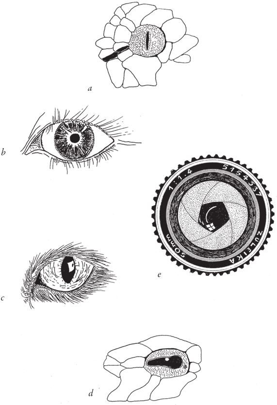 Рис. 5.15. Типы зрачков, в том числе зрачок фотообъектива. Форма зрачка не имеет критического значения, поэтому он может быть любым: (а) сетчатый питон; (b) человек; (с) кошка; (d) древесная змея длиннорылая плетевидка; (е) фотообъектив.