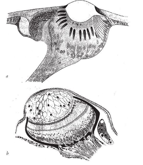 Рис. 5.16. Два варианта развития хрусталика у насекомых: (а) личинка пилильщика; (b) подёнка.