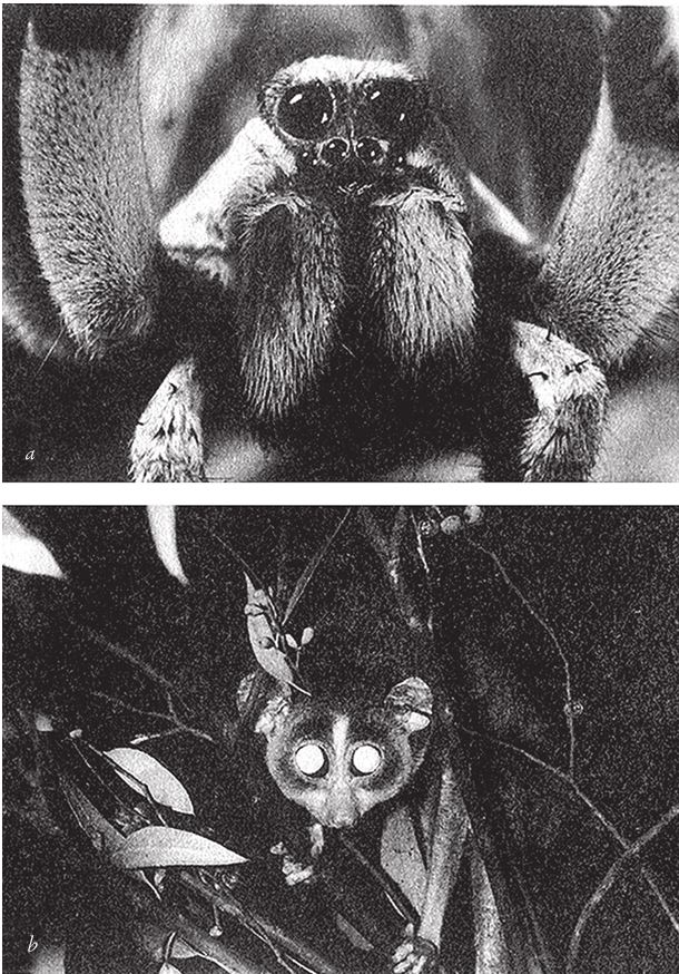 Рис. 5.19. Отраженные фотоны не пропадут зря. Сияющая отражательная оболочка, тапетум, паука-волка, Geolycosa sp. (а) и золотистого потто (b).