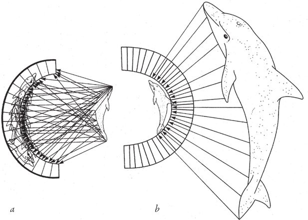 Понятно, почему такой глаз называется суперпозиционным, хотя в строгом смысле им не является. При истинном наложении с использованием сложных линз и зеркал проходящий через соседние фасетки свет суммируется, и все фотоны, которые излучают голова или хвост дельфина, оказываются в одних и тех же соответствующих этим участкам местах. При нейросуперпозиционном механизме фотоны по?прежнему попадают в разные места, как и в аппозиционном глазу. Но благодаря точно рассчитанному переплетению нервных волокон, ведущих к мозгу, сигналы от них сходятся.