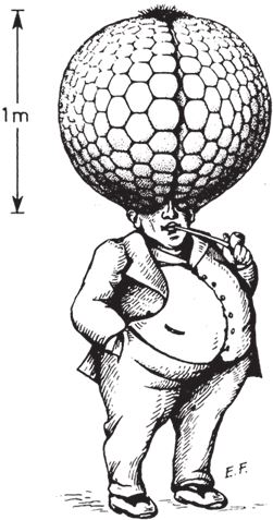 Например, основные свойства фасеточного глаза позволяют стрекозе выследить и догнать летящую муху, но чтобы разглядеть объект во всех подробностях, доступных нашему зрению, фасеточный глаз должен быть гораздо больше человеческого камерного. Этому можно дать примерно следующее объяснение. Очевидно, чем больше омматидиев, направленных в разные стороны, тем более детальным будет изображение. Стрекоза обладает примерно 30000 омматидиев, и этого вполне достаточно для охоты на лету (рис. 5.21). Но чтобы видеть так же хорошо, как видим мы, требуются миллионы омматидиев, а чтобы в глазу уместились миллионы омматидиев, они должны быть совсем крошечными. К сожалению, омматидий не может быть меньше определенного размера. Такие же ограничения, как мы видели, накладываются на размер глазного отверстия – это называется дифракционный предел. Из-за этого ограничения фасеточный глаз, если мы хотим добиться такого же качества изображения, какое дает наш камерный глаз, должен быть несообразно огромным – 24 м в диаметре! Немецкий ученый Куно Киршфельд нарисовал эффектную иллюстрацию – человека с фасеточными глазами и нормальной остротой зрения (рис. 5.22). Сотовая структура – это авторская интерпретация. В реальности каждая фасетка составного глаза скрывает в себе 10000 омматидиев. Киршфельд исходил из того, что люди хорошо видят только центральной зоной сетчатки, поэтому “человеческий” фасеточный глаз в его представлении вырос не до двадцати четырех метров, а лишь до одного. Двадцать четыре метра в диаметре или один – все равно с такими глазами ходить не будешь. Вывод: хотите четко видеть мир и ничего не упустить – выбирайте не составной фасеточный глаз, а простой камерный с одним, но качественным хрусталиком. Дэн Нильссон даже заметил про фасеточный глаз: “Мы не сильно погрешим против истины, если скажем, что эволюции пришлось выдержать отчаянную битву за исправление чудовищных, по сути, ошибок природы”.