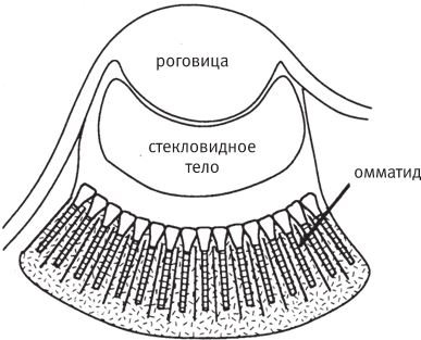 Фасеточный глаз представляет собой плотное скопление длинных прямых трубок, направленных во все стороны по радиусам от выпуклой поверхности. Каждая трубка, словно прицел винтовки, смотрит на один маленький участок пространства, который находится непосредственно на ее “линии огня”. Можно продолжить идею фильтрации – стенки трубки и поверхность купола не дают лучам других направлений попасть в нее и достигнуть фоторецепторов в ее задней части.