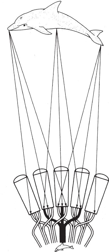 Однако в глазу мухи продукты работы шести зрительных клеток не объединяются по принципу все со всеми. Каждая клетка работает совместно лишь с определенными клетками соседнего омматидия (рис. 5.27). На этом рисунке масштаб изменен для наглядности. Из тех же соображений стрелки показывают не преломленные хрусталиком лучи, а соответствие точек дельфина точкам на дне трубок. А теперь оцените гениальность этой схемы. Суть идеи в том, что клетки, которые смотрят на голову дельфина и находятся в соседних омматидиях, функционируют сообща; клетки, которые смотрят на хвост дельфина и находятся в соседних омматидиях, тоже функционируют сообща. И так далее. В итоге сигнал от каждого фрагмента тела дельфина формируется более интенсивным потоком фотонов по сравнению с обычным аппозиционным глазом и его простой системой омматидиев. Можно сказать, старая задача приумножения числа фотонов, которые излучают отдельные точки на теле дельфина, решается по?новому – не оптическими методами, а тонким расчетом.