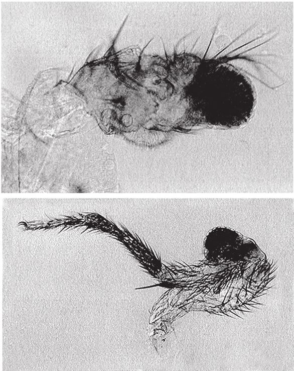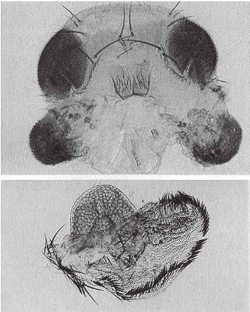 Рис. 5.29. Эктопические глаза дрозофилы, появившиеся в результате научного эксперимента; глаз на фото внизу образовался под влиянием мышиного гена.