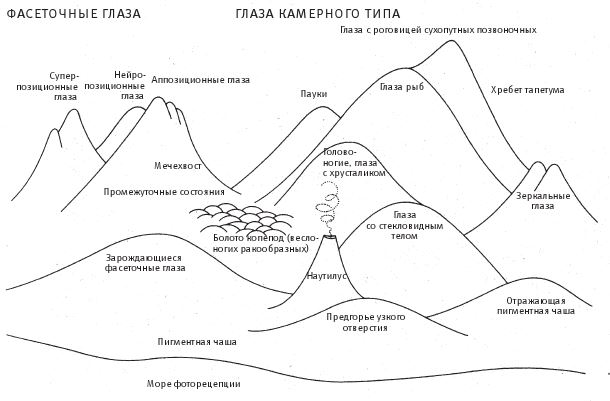 Рис. 5.30. Глазной район горы Невероятности: ландшафт эволюции глаз в интерпретации Майкла Лэнда.