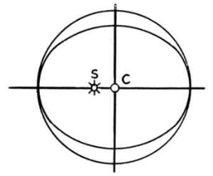 Кеплер пока что не знал, что орбиты представляют собой эллипс; сам он все еще рассматривал их как окружности. Но даже и так, чтобы получить приблизительно корректные результаты, центр окружности необходимо было разместить в точке С, а не в Солнце. Соответственно, тут же возникает вопрос: если сила, которая движет планетами, исходит из точки S, почему они продолжают вращаться вокруг С? Кеплер ответил на этот вопрос предположением, что каждая планета являлась субъектом двух конфликтующих влияний: силы Солнца и второй силы, размещенной в самой планете. Такое перетягивание каната приводило к тому, что планета то приближалась к Солнцу, то отходила от него.