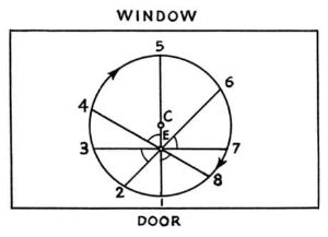 Предположим, что окружность – это рельсы игрушечного поезда, ползающего вокруг комнаты. Находясь ближе к окну, от движется чуточку быстрее, приближаясь к дверям – чуточку медленнее. Предполагая то, что подобные периодические изменения скорости подчиняются какому-то простому, но окончательному правилу, мы можем установить punctum equant, "Е", если глядеть из которого, то будет казаться, будто бы поезд движется с постоянной скоростью. Чем ближе мы находимся к движущемуся поезду, тем быстрее, нам кажется, он перемещается; отсюда следует, что punctum equans должен находиться где-то между центром "С" рельсового пути и дверью, так, что дополнительная скорость поезда, проезжающего мимо окна, будет вычитаться расстоянием, а недостаток скорости при проезде мимо двери будет компенсироваться близостью. Польза, полученная путем введения воображаемого экванта, заключается в том, что, глядя из точки Е, поезд кажется нам движущимся с постоянной скоростью, поскольку он будет преодолевать равные угловые расстояния за одинаковые отрезки времени – что дает нам возможность рассчитать различные положения поезда: 1, 2, 3 и т.д. для любого момента времени.