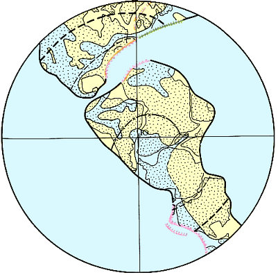 Положение литосферных плит и срединно-океанических хребтов в позднем карбоне и ранней перми.