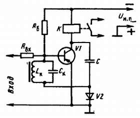 Контур LкСк, как и любой колебательный контур, на всех частотах, кроме резонансной, на которую он настроен, представляет собой малое сопротивление. Для колебаний резонансной частоты его сопротивление велико. Поэтому если частота командного сигнала на входе Г-образного фильтра не равна резонансной частоте контура LкСк, то на выходе этого фильтра, являющемся входом транзистора V1 (нижняя точка контура через диод V2 соединена с эмиттером транзистора), напряжение практически отсутствует. В этом случае все напряжение командного сигнала падает на резисторе Rвх. В это время коллекторный ток транзистора мал, так как на базу через резистор Rб подается малое напряжение смещения и транзистор почти закрыт. Когда же частота командного сигнала становится равной резонансной частоте контура LкСк, на нем создается сравнительно большое переменное напряжение звуковой частоты, которое практически без потерь подается на базу транзистора. Усиленное транзистором, оно выпрямляется диодом V2 и через катушку Lк подается на его базу в отрицательной полярности. При этом транзистор открывается, его коллекторный ток резко возрастает, отчего реле К срабатывает, а его контакты замыкают цепь питания исполнительного механизма.