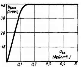 Зависимость выходного напряжения ограничительного каскада от напряжения на его входе изображена графически на рис. 345. На графике видно, что как бы ни повышалось входное напряжение, начиная с 0,1 В, напряжение на выходе ограничительного каскада не увеличится более чем до 4 В.