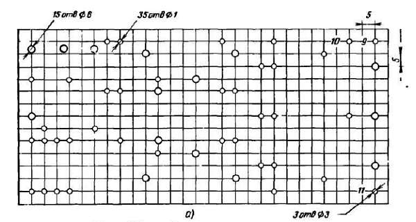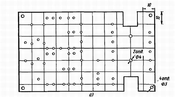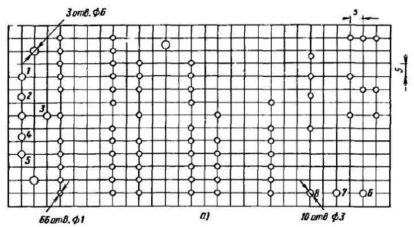 Увеличив чертеж до натуральной величины, наклей его на плату и уже по нему сверли отверстия. Отверстия диаметром 4 мм предназначены для крепления электромагнитных реле, диаметром 3 мм — для крепления платы на модели, отверстия меньшего диаметра — для проволочных монтажных стоек-шпилек.