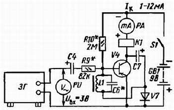 Налаживание приемника начинай с проверки работы фильтров СЭР дешифратора. Сначала проверь фильтр СЭР первого, затем второго канала управления. На вход селективного электронного реле СЭР1 через электролитический конденсатор С4, предварительно отпаяв его от резистора R7 и поменяв полярность его включения, подай от звукового генератора сигнал напряжением 3 В, а в коллекторную цепь транзистора V4 включи миллиамперметр РА на ток 20–30 мА (рис. 348).