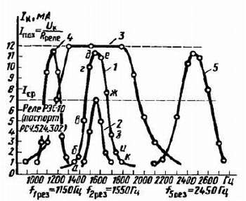 Если электромагнитное реле типа РЭС-10 с обмоткой сопротивлением 630 Ом (паспорт РС4.524.302), то при частоте 1550 Гц ток коллектора достигает наибольшего значения (точка д), а затем начинает уменьшаться. Если значения тока коллектора отмечать точками примерно через каждые 500 Гц (точки е, ж, з, и, к), а затем все эти точки соединить сплошной линией, получится график частотной характеристики фильтра. Для: нашего случая это будет кривая 1, соответствующая резонансной частоте фильтра 1550 Гц при R9 = 82 кОм и С6 = 0,05 мкФ.