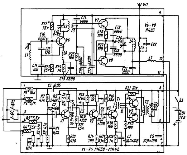 Он, как видишь, транзисторный. Состоит из задающего генератора с усилителем мощности и модулятора, обведенных на схеме цветными линиями. Цифрами 1-11 обозначены точки подключения к платам передатчика источника питания и кнопочного пульта управления. Передатчик питается от батареи напряжением 12 В, составленной из трех батарей 3336Л.